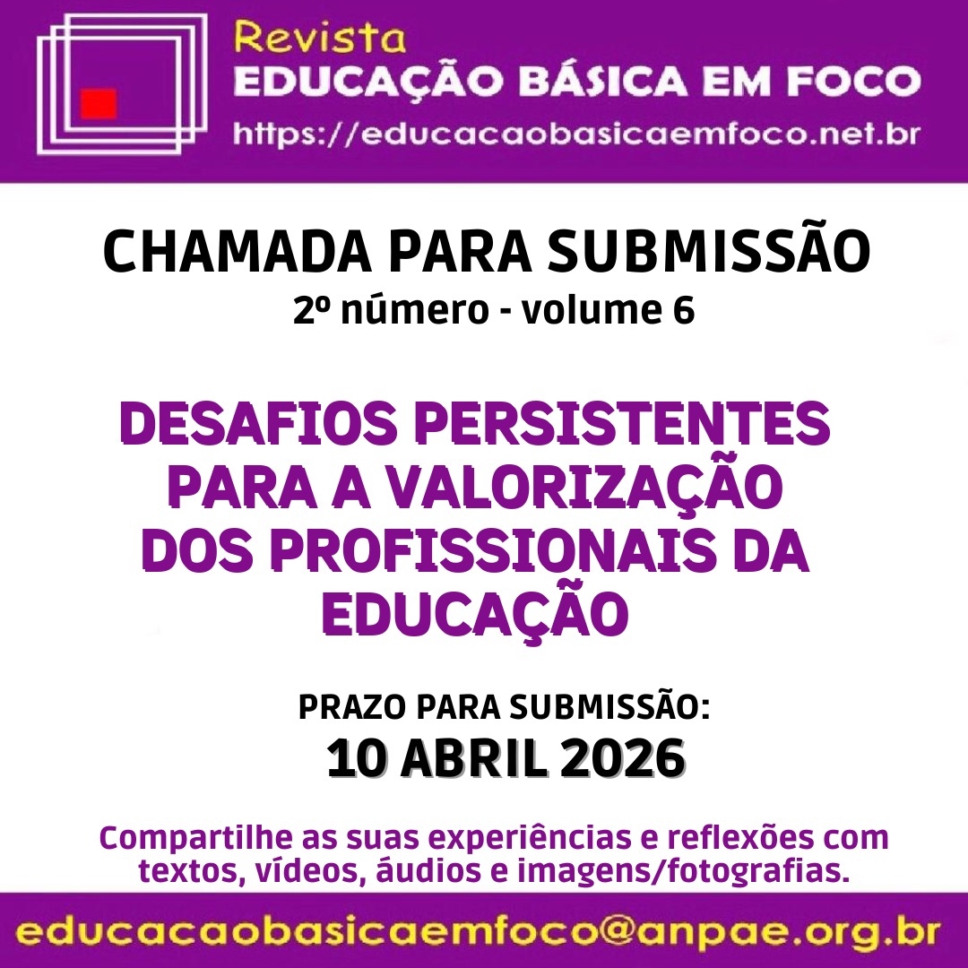 A Revista Educação Básica em Foco é uma das iniciativas institucionais que concretizam o compromisso da Associação Nacional de Política e Administração da Educação (ANPAE) de subsidiar debates e proposições relativos às políticas e à administração da Educação Básica no Brasil, pautadas pela garantia do direito à educação de qualidade para todos e pelo fortalecimento da gestão democrático-participativa na educação pública. Constitui-se como espaço de divulgação, intercâmbio e debate de conhecimentos produzidos em diferentes espaços e instâncias educativas – escola básica, universidades, fóruns de educação, entidades sindicais, movimentos sociais e estudantis etc. -, propiciando a divulgação de iniciativas e ações desenvolvidas nas redes de ensino e suas instâncias – central, regionais e escola – e contribuições oriundas de estudos realizados em universidades e outras instituições de pesquisa, que colaborem efetivamente para a garantia do direito e da gestão democrática da educação pública brasileira.