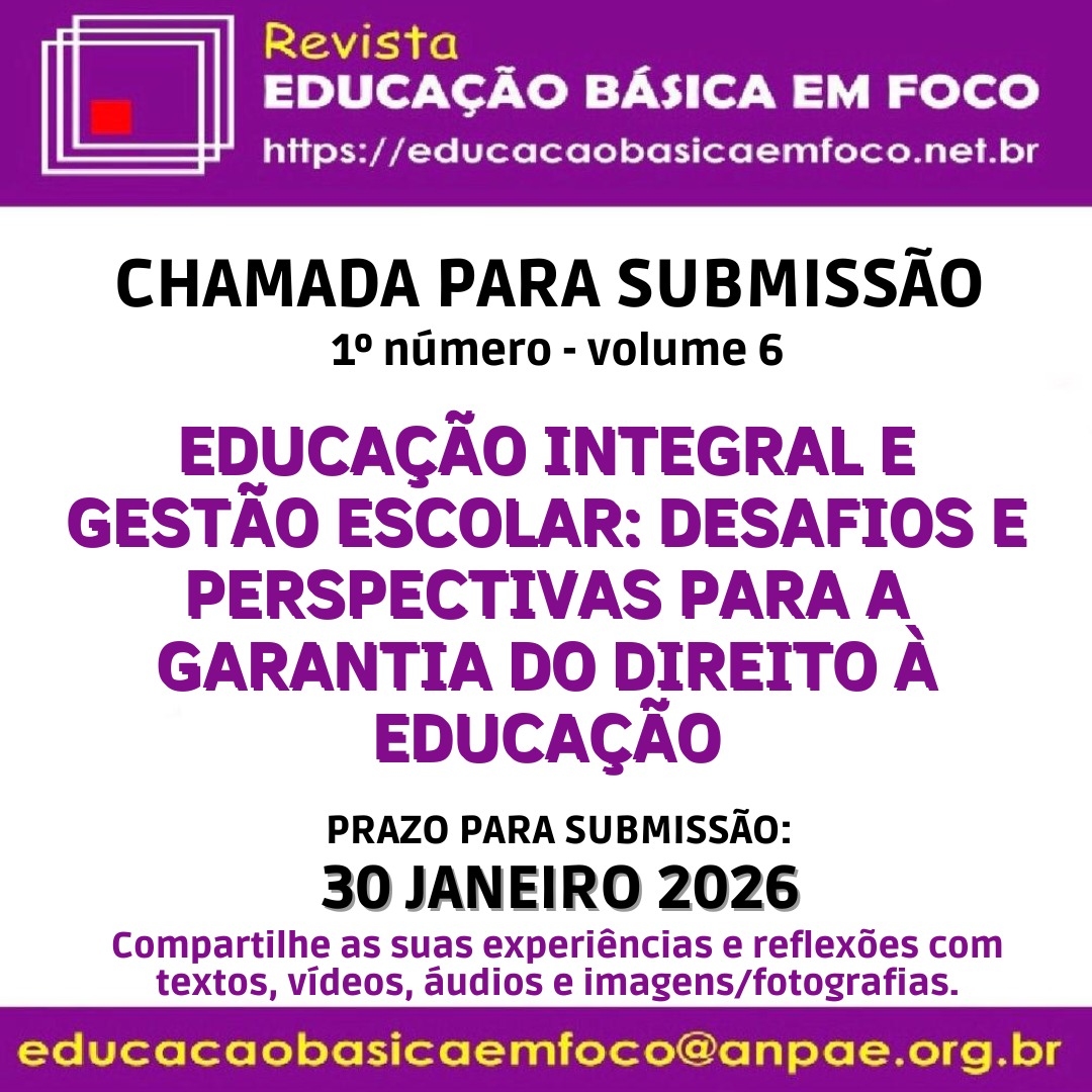 A Revista Educação Básica em Foco é uma das iniciativas institucionais que concretizam o compromisso da Associação Nacional de Política e Administração da Educação (ANPAE) de subsidiar debates e proposições relativos às políticas e à administração da Educação Básica no Brasil, pautadas pela garantia do direito à educação de qualidade para todos e pelo fortalecimento da gestão democrático-participativa na educação pública. Constitui-se como espaço de divulgação, intercâmbio e debate de conhecimentos produzidos em diferentes espaços e instâncias educativas – escola básica, universidades, fóruns de educação, entidades sindicais, movimentos sociais e estudantis etc. -, propiciando a divulgação de iniciativas e ações desenvolvidas nas redes de ensino e suas instâncias – central, regionais e escola – e contribuições oriundas de estudos realizados em universidades e outras instituições de pesquisa, que colaborem efetivamente para a garantia do direito e da gestão democrática da educação pública brasileira.