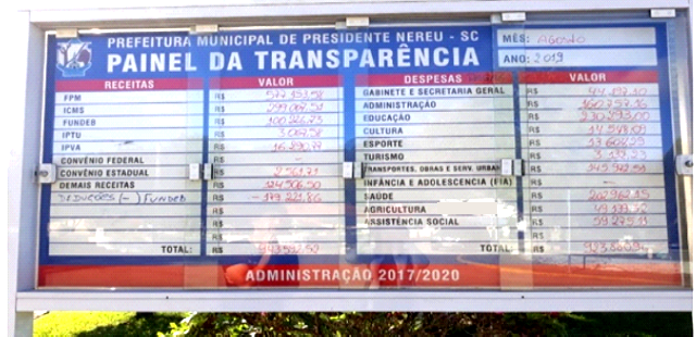 Imagem encaminhada pela doutoranda em Educação Ana Paula Motta. A foto é de um mural da transparência do município de Presidente Nereu, estado de Santa Catarina. Ele fica localizado em frente a Prefeitura como mecanismo de divulgação das receitas e despesas mensais do município. Fazendo uma análise dos valores de receita e despesas do município no mês de agosto de 2019, o Fundeb representa para municípios, como o de Presidente Nereu, uma possibilidade, senão a única, para honrar com os pagamentos dos salários dos professores e manutenção da educação, analisa a professora.