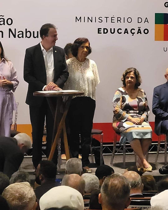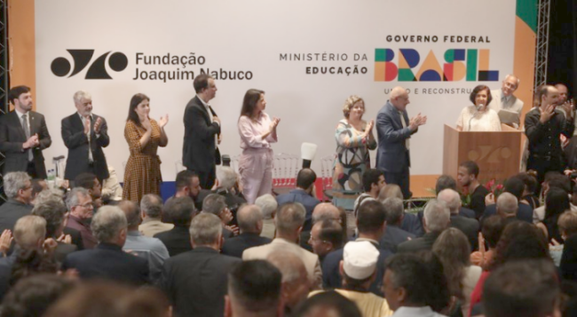 Professora Marcia Angela Aguiar finalizando seu discurso de posse como presidenta da FUNDAJ. Na mesa da esquerda para direita, vice-presidente da Assembleia Legislativa do Estado de Pernambuco (Alepe), deputado Aglailson Victor, o senador Humberto Costa, a vice-governadora Priscila Krause, o ministro de educação, Camilo Santana, a governadora de Pernambuco Raquel Lyra, a senadora Tereza Leitão e o Reitor da UFPE, Professor Alfredo Gomes.